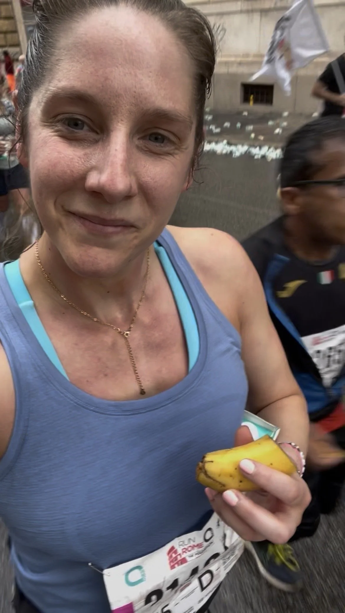 3) Nutrition was on point. I knew it was going to be difficult for my body to get through a marathon so I HAD to make sure my nutrition was the best it could be. I took a salt tablet every half an hour. I ate cliff-blocks gel cubes as regularly as I could – I ended up having 2 and a half packets of these. At every aid station (there were 17 – Rome marathon is so well planned!) apart from the last 2 which were at 39 and 40km, I made sure to get electrolytes, water, some banana and maybe a cracker or a biscuit. So 13 aid stations had food where I got all this, the other 2 I got electrolytes and water. I also had a carb powder drink in one pocket and water in my other pocket which got me through the first 10-15km on top of the aid stations. I carb loaded without overloading and feeling sluggish prior to the event, I had electrolytes every day for the 5 days leading up to the event, and I made sure I was well hydrated in the days leading up to it too. Nutrition is a huge part of endurance events and can make or break it.