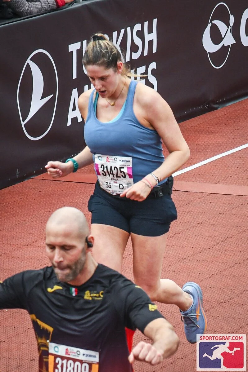 When I got to this point, I took some fuel from one last aid station and just thought, right this is it now, head down, just keep running, no walking, let’s get to that finish line. It was hard. I was in pain. I felt emotional. But I knew the sub 5 hours was in my grasp. My watch GPS was a bit out (this is usually due to weaving in and out of runners adding extra metres on) and I knew from passing the checkpoints that my watch was about 600m ahead ish but I wasn’t 100%. So I was just willing that finish line to get closer and closer. My hands were in fists at this point, I just had to keep going. The streets became very narrow and crowded and it was requiring a lot of concentration to not bash into people as everyone was very much in their own world at this point and running all over the place (understandably so!).