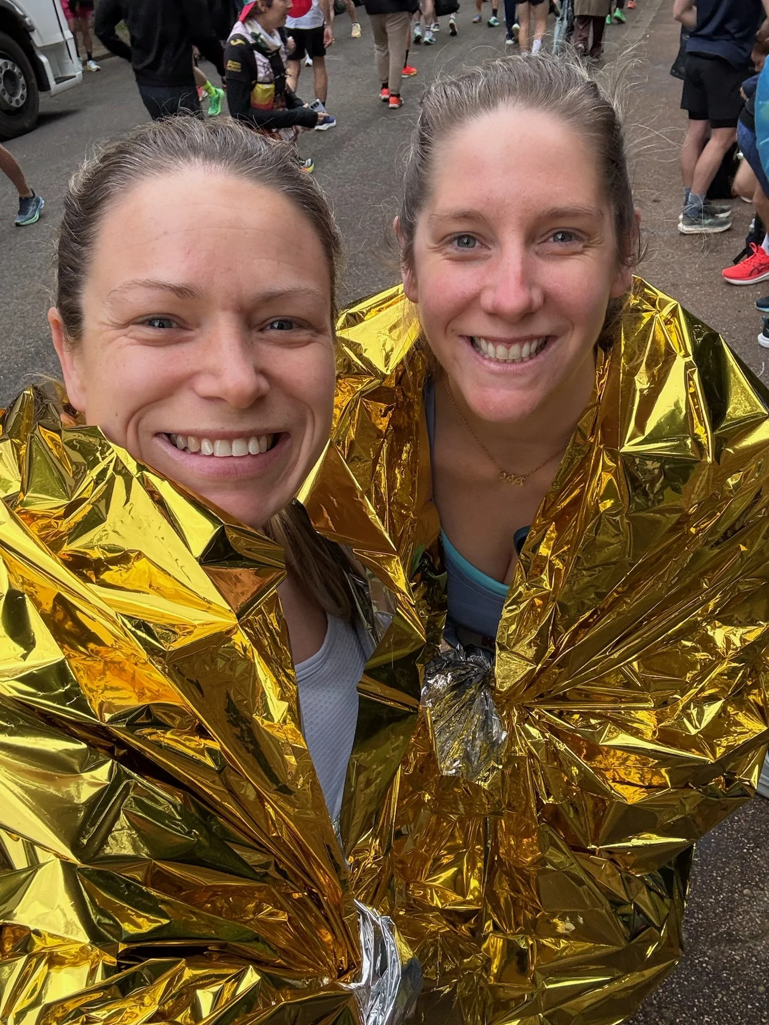 We had hoped to try and walk to the start line but our explorations two days prior revealed it was further than we originally thought, so we booked a taxi to get us there before the road closures and thankfully it all went to plan and we got there with plenty of time. We had also anticipated the fact that we would be waiting around a while before our start wave and when we realised we hadn’t brought a spare top or jumper we could leave at the start line, Em came up with a good idea of getting some foil blankets – so the day before we had found two in a chemist! So glad we had these because they really helped! Also, make sure you have some tissues for the portaloos beforehand… really not a pleasant experience and I am grateful Em remembered to bring these!